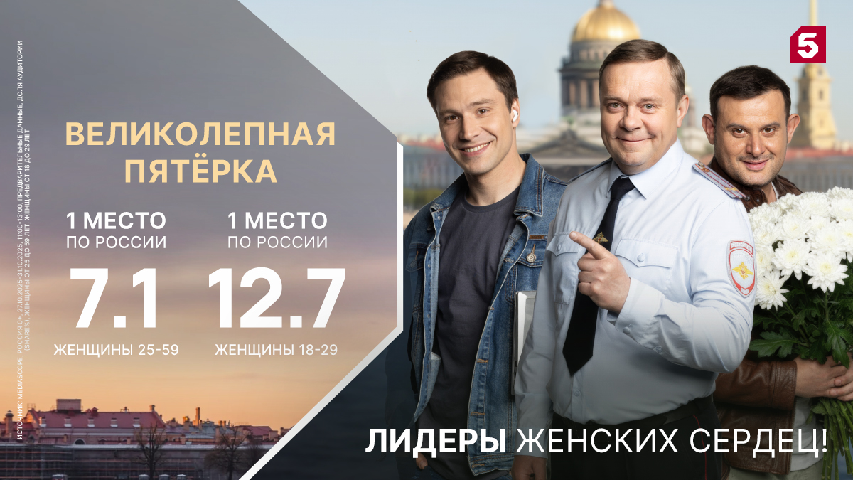 На неделе с 27 по 31 октября «Великолепная Пятерка» стала лучшим детективом утра сразу в двух аудиториях. В тайм-слоте 11:00–13:00 с понедельника по пятницу 7,1% телезрительниц от 25 до 59 лет (1,6 млн человек) проводили время в компании оперативников Петровского РОВД. Еще выше — 12,5% — доля в аудитории «Женщины 18-29». Отличное начало дня и первое место для Пятого канала!