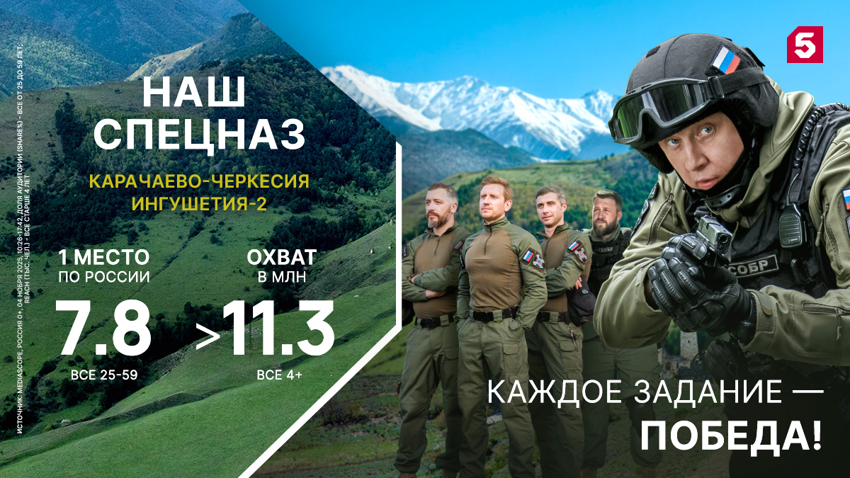 Во вторник, 4 ноября, премьерные спецсерии «Наш спецназ. Карачаево-Черкесия» и «Наш спецназ. Ингушетия-2» стали эфирным событием. В ключевой аудитории «Все 25-59» 7,8% телезрителей страны провели День народного единства за просмотром новых эпизодов, съемки которых проходили на Кавказе. Это обеспечило каналу в тайм-слоте 10:26–17:42 первое место среди всех федеральных вещателей. Также за приключениями группы «Трефы» в этот день следило 11,4 млн телезрителей страны старше четырех лет.