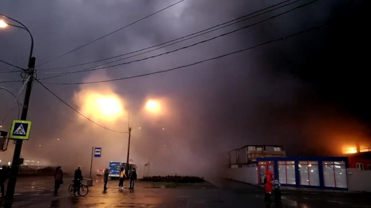Судя по фото, пожар серьезный — со стороны стройки валит густой черный дым. На место уже прибыли пожарные, конструкции сейчас проливают.
