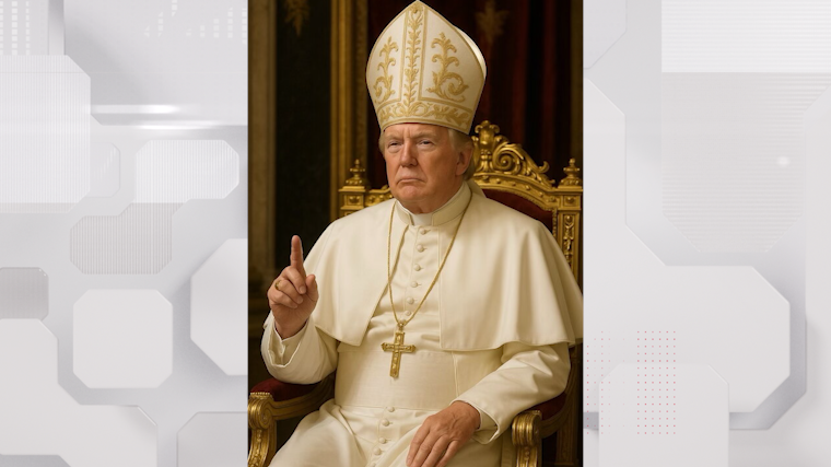 На изображении, которое, предположительно, создали с использованием нейросетей, Трамп сидит на позолоченном стуле в белом одеянии Папы с традиционной митрой на голове и с большим золотым крестом на шее.