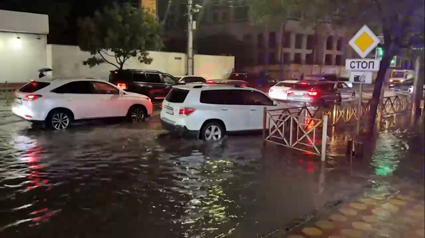 «Люди переходят дорогу по колено в воде. Машины тоже едва-едва могут пробраться через пробки», — передает корреспондент «Известий» Мурад Магомедов с места событий.