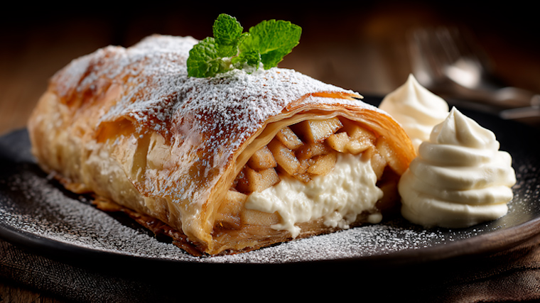 В числе самых популярных десертов в ресторанах сегодня остается венский штрудель. Он появился в России еще в XIX веке, будучи заимствованным Австрией у восточной кухни как вариация пахлавы. Классический рецепт предполагает яблоки, приготовленные в слоях очень тонкого теста.