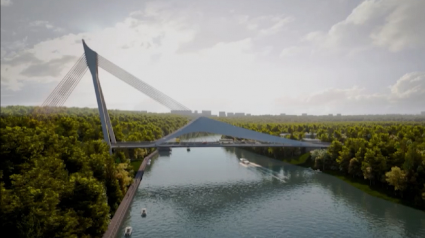 Сейчас специалисты проводят работы по укрупнительной сборке металлоконструкций. Затем начнут монтировать пролетное строение над правым берегом и возводить 86-метровый пилон, который станет опорой всей конструкции.