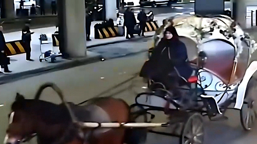 Видео, которое записали очевидцы, быстро попало в соцсети. На кадрах видно, как к воздушной гавани подъезжает изящная карета, запряженная гнедым скакуном. Извозчик придерживает коня перед шлагбаумом и вместе с остальными участниками движения добирается до зоны прибытия.