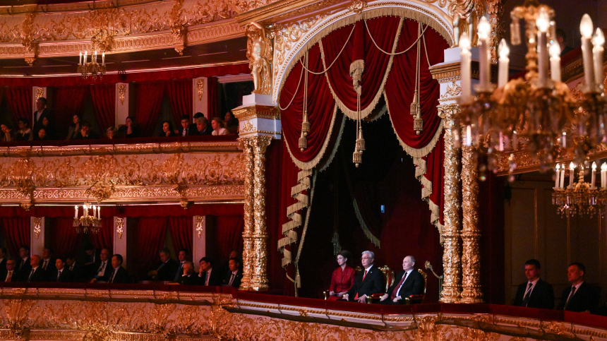 Рядом с лидерами находились министры культуры РФ и Казахстана Ольга Любимова и Аида Балаева, а также генеральный директор Большого театра и дирижер Валерий Гергиев.