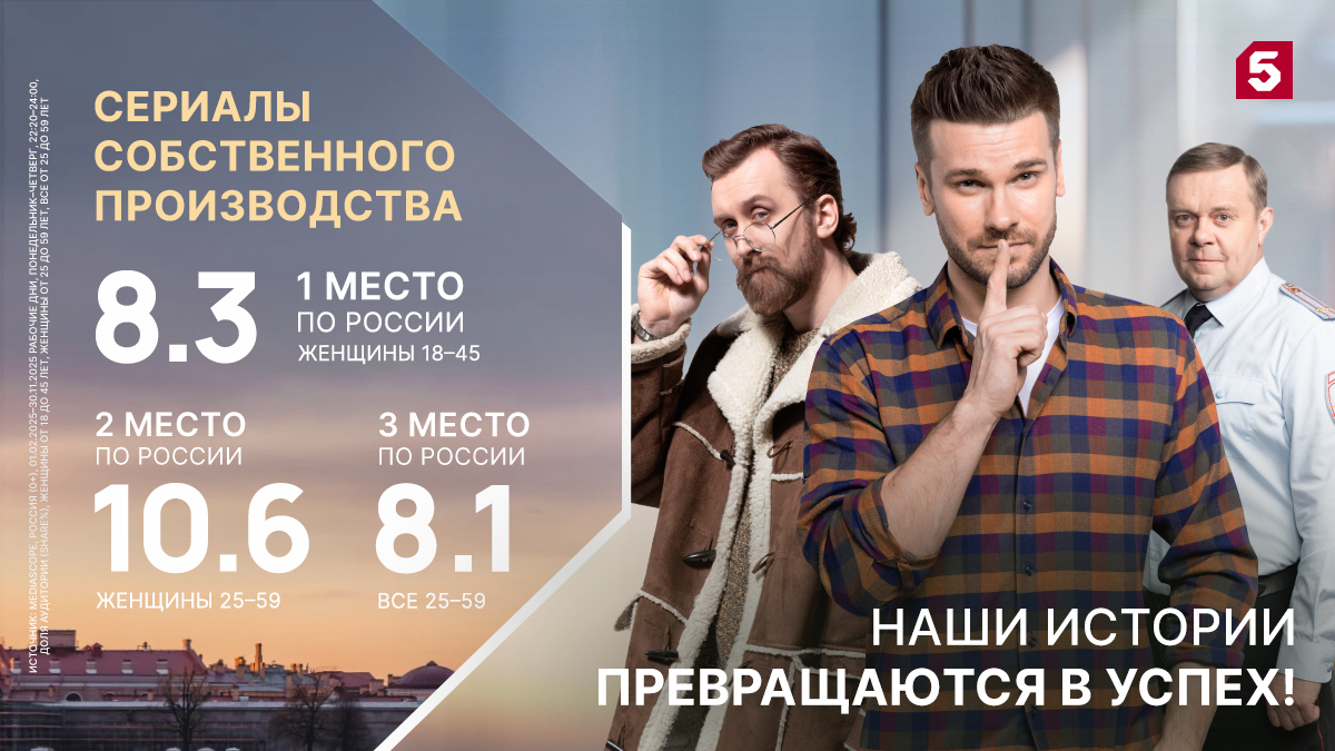 Основным достижением Пятого канала к 2025 году стала полная контентная независимость. Это главный итог стратегического курса, который был ориентирован на максимальное наполнение эфирной сетки сериалами и программами собственного производства. На сегодняшний день канал практически отказался от покупного контента и создал свой уникальный медийный стиль и вселенную киногероев.