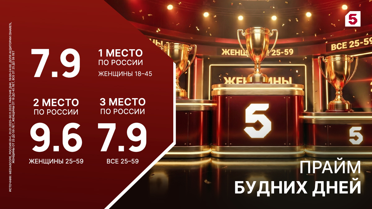 В тайм-слоте 19:00-00:00 в рабочие дни фильмы и программы Пятого – первые по популярности у женщин «18-45» (доля 7,9%), вторые среди зрительниц «25-59» (доля 9,6%) и третьи в ключевой аудитории «Все 25-59» (доля 7,9%).