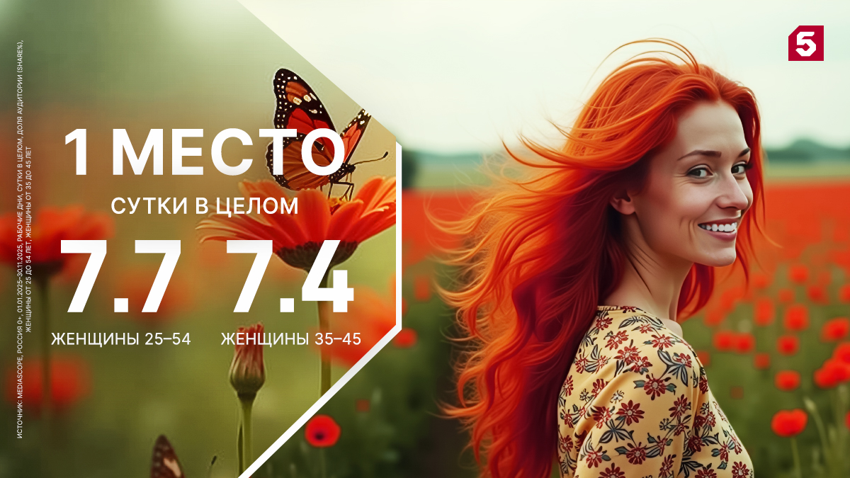 Сразу в двух женских аудиториях – «25-54» и «35-45» – Пятый занимает первую ступеньку пьедестала федерального эфира по просмотрам за сутки в целом в рабочие дни. Средние доли составили 7,7% и 7,4% соответственно.