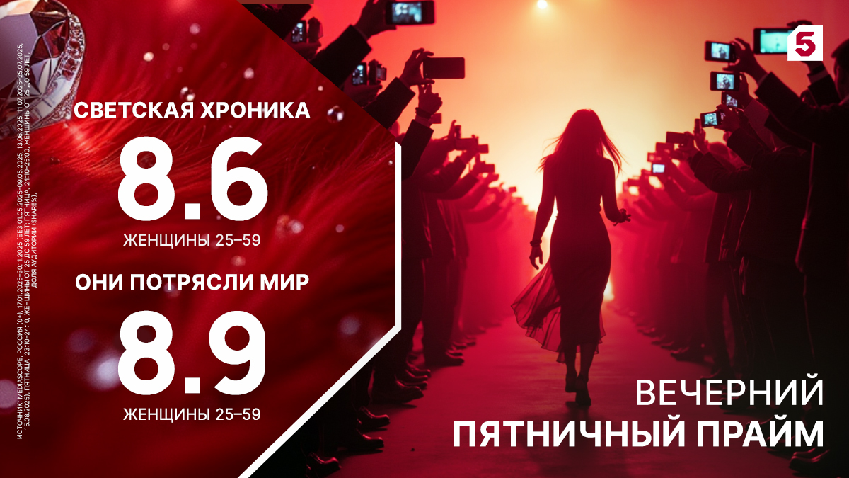 Информационно-развлекательная программа «Светская хроника» о жизни звезд шоу-бизнеса занимает второе место в вечернем прайме пятницы с долей 8,6% в женской аудитории возрастного сегмента «25-59». Третье место у документального проекта «Они потрясли мир». Ему отдают предпочтение 8,9% телезрительниц страны от 25 до 59 лет.