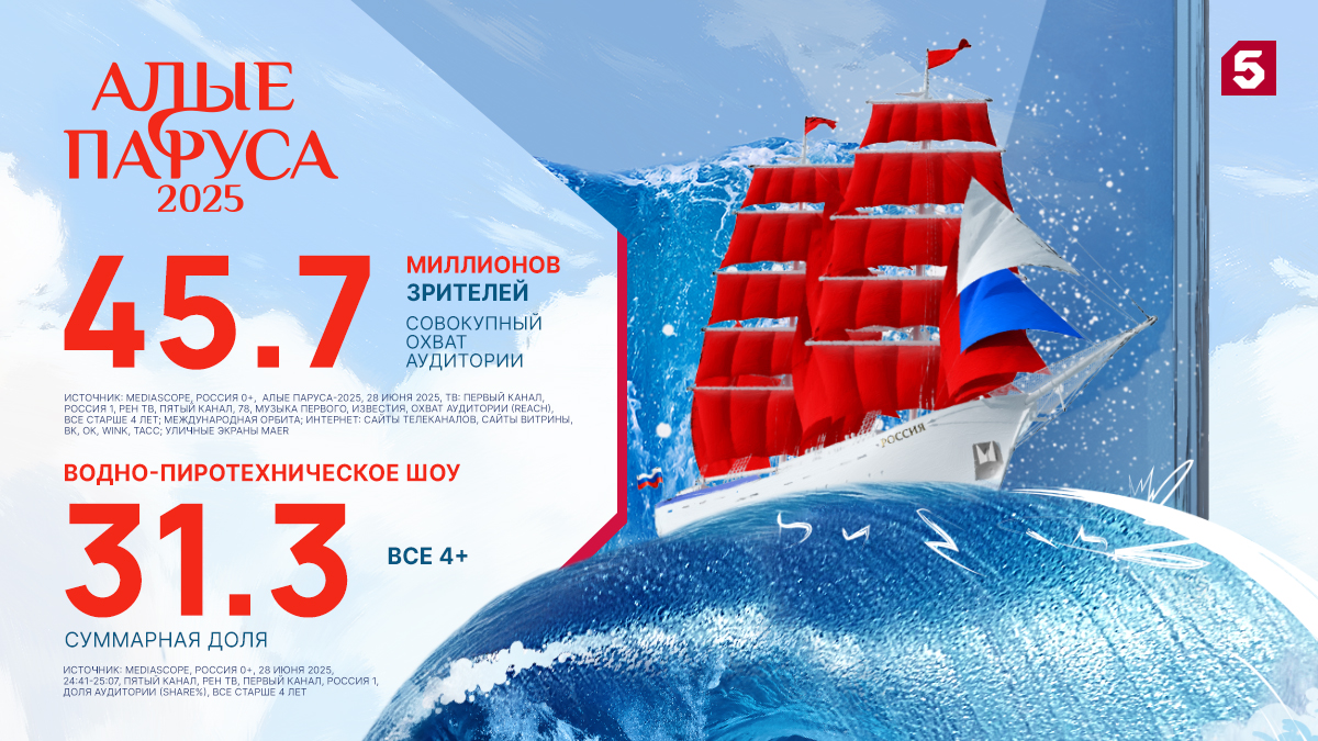 Много лет Пятый канал является организатором водно-пиротехнического шоу «Алые паруса» и с 2005 года ведет прямую трансляцию праздника выпускников в эфире, на сайте Пятого и в своих официальных аккаунтах в социальных сетях. «Алые паруса-2025» были посвящены юбилею Великой Победы. Легендарный выпускной посмотрели рекордные 45,7 миллионов человек по всему миру. Это на 8,7 миллиона больше, чем в прошлом году. Телевизионная аудитория фантастического водно-пиротехнического шоу в акватории Невы и концерта самых популярных звезд российской эстрады на Дворцовой площади составила около 31,7 миллиона человек. Количество просмотров онлайн-трансляции в Сети интернет – 13,7 миллиона. Еще 300 тысяч человек смотрели праздник в прямом эфире на больших уличных экранах в крупных городах.