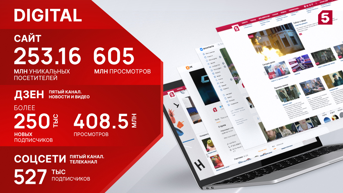 Официальный аккаунт сайта на платформе «Дзен» – «Пятый канал. Новости и видео» – привлек свыше 250 000 новых подписчиков. Общая численность фолловеров составила почти миллион человек. Количество просмотров контента увеличилось на 46% до 408,5 миллионов.
