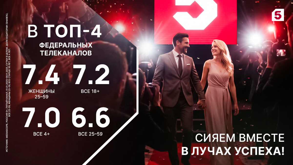 По предварительным данным, в 2025 году Пятый сохранил свои позиции в ТОП-4 федеральных каналов в ключевой аудитории «Все 25-59» с долей 6,6%. В базовых аудиториях «Все 4+» и «Все 18+» доли составили 7,0% и 7,2% соответственно. По-прежнему Пятый занимает второе место в женской аудитории «25-59» с долей 7,4% за сутки в целом.