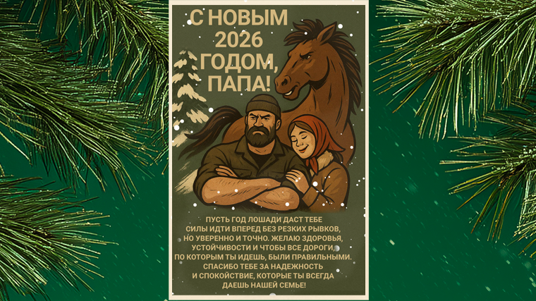 «С Новым 2026 годом, папа! Пусть год Лошади даст тебе силы идти вперед без резких рывков, но уверенно и точно. Желаю здоровья, устойчивости и чтобы все дороги, по которым ты идешь, были правильными. Спасибо тебе за надежность и спокойствие, которые ты всегда даешь нашей семье!»