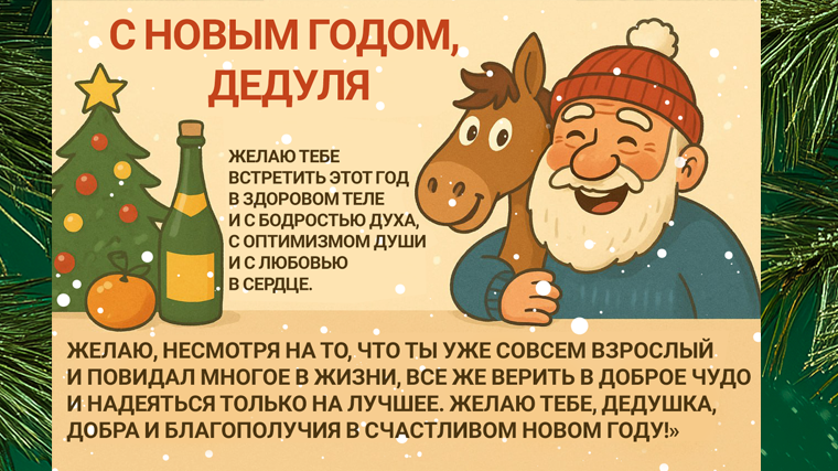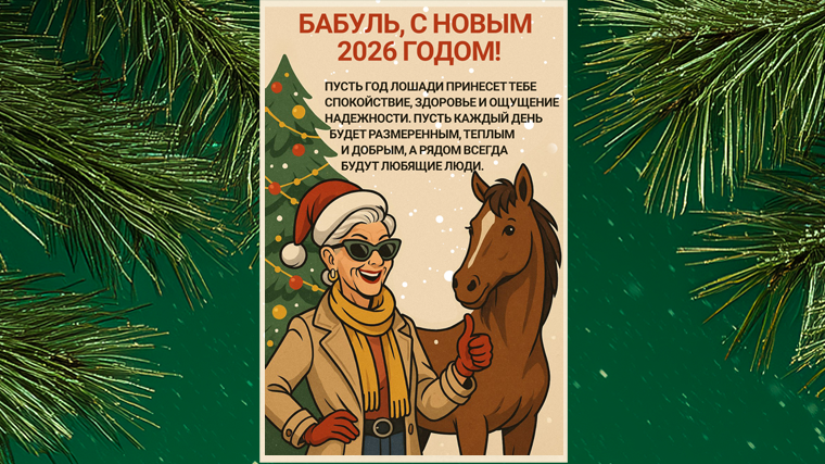 «Бабуль, с Новым 2026 годом! Пусть год Лошади принесет тебе спокойствие, здоровье и ощущение надежности. Пусть каждый день будет размеренным, теплым и добрым, а рядом всегда будут любящие люди. Очень хочу, чтобы ты чувствовала себя в безопасности и заботе».