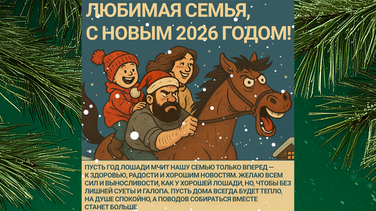 «Любимая семья, с Новым 2026 годом! Пусть год Лошади мчит нашу семью только вперед — к здоровью, радости и хорошим новостям. Желаю всем сил и выносливости, как у хорошей лошади, но, чтобы без лишней суеты и галопа. Пусть дома всегда будет тепло, на душе спокойно, а поводов собираться вместе станет больше».