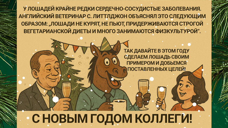 «У лошадей крайне редки сердечно-сосудистые заболевания. Английский ветеринар С. Литтлджон объяснял это следующим образом: „Лошади не курят, не пьют, придерживаются строгой вегетарианской диеты и много занимаются физкультурой“. Так давайте в этом году сделаем лошадь своим примером и добьемся поставленных целей! С Новым годом!»