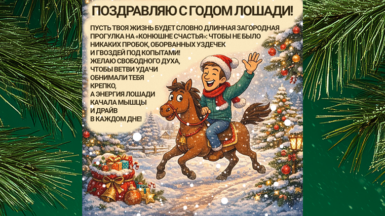 «Поздравляю с годом Лошади! Пусть твоя жизнь будет словно длинная загородная прогулка на „конюшне счастья“: чтобы не было никаких пробок, оборванных уздечек и гвоздей под копытами! Желаю свободного духа, чтобы ветви удачи обнимали тебя крепко, а энергия лошади качала мышцы и драйв в каждом дне!»