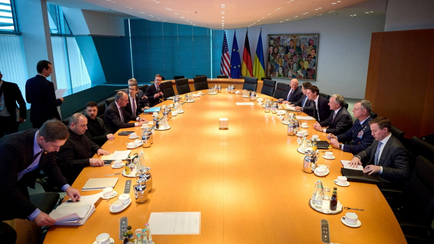 Кто и с кем пытается договориться? Зеленский — не в Киеве и даже не в украинском посольстве — переговоры на территории ведомства канцлера ФРГ, у одного — ни капли самостоятельности, у другого — никакого нейтралитета: Мерц в роли опекуна, уже на входе берет его под свое орлиное крыло и буквально под ручку выводит на консультации с Уиткоффом и Кушнером.