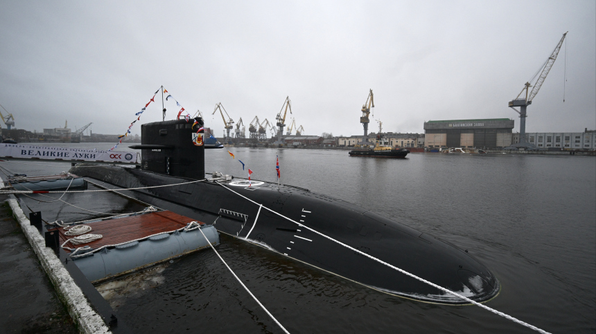 В Петербурге торжественно подняли Андреевский флаг на новейшей подлодке «Великие Луки». Субмарина построена на «Адмиралтейских верфях» для Балтийского флота.