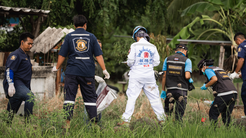 Правоохранители зафиксировали признаки взлома, разбросанные вещи на первом этаже, капли крови и осколки стекла. Примерно в 300 метрах от дома они обнаружили мужчину с глубокими порезами. Его срочно доставили в больницу Бангпаконг из-за массивной кровопотери, но спасти подозреваемого медикам не удалось. Скорее всего, он запаниковал при звонке женщин в полицию, разбил стекло при бегстве и получил тяжелые раны.