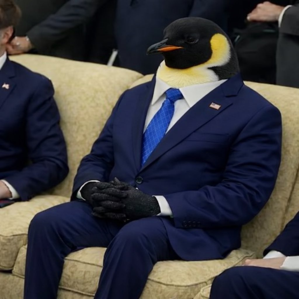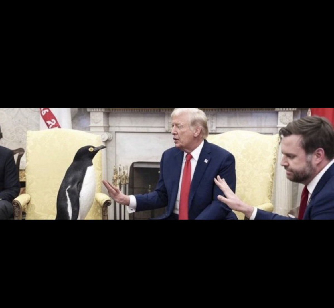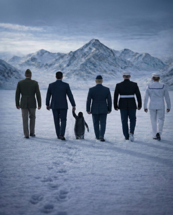 Белый Дом опубликовал в соцсети X фото, на котором президент США Дональд Трамп идет по снегу вместе с пингвином, держащим в плавнике американский флаг. Судя по картинке, политик и арктическая птица вместе приближаются к Гренландии. Публикация мема сопровождается лаконичной подписью «Обними пингвина». Примечательно то, что пингвины не живут на территории Гренландии.