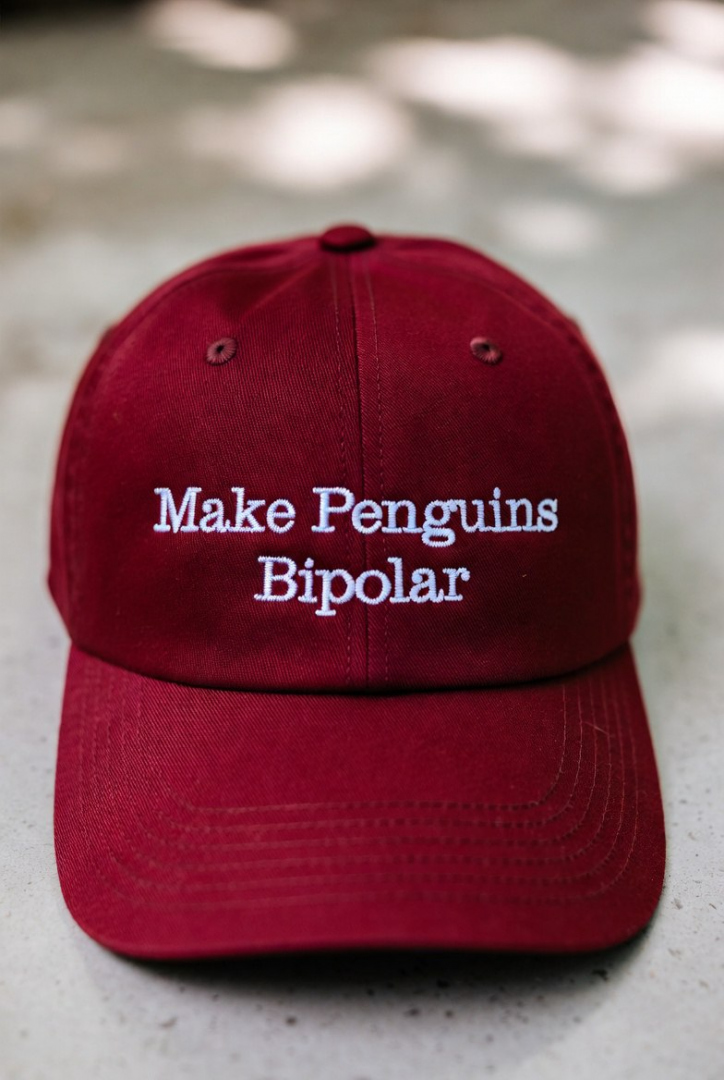 Другой шутник опубликовал красную кепку в стиле Make America Great Again (слоган Трампа, «Сделаем Америку Великой снова»), иронично обыграв ее так, что в итоге получился девиз «Сделаем пингвинов биполярными».