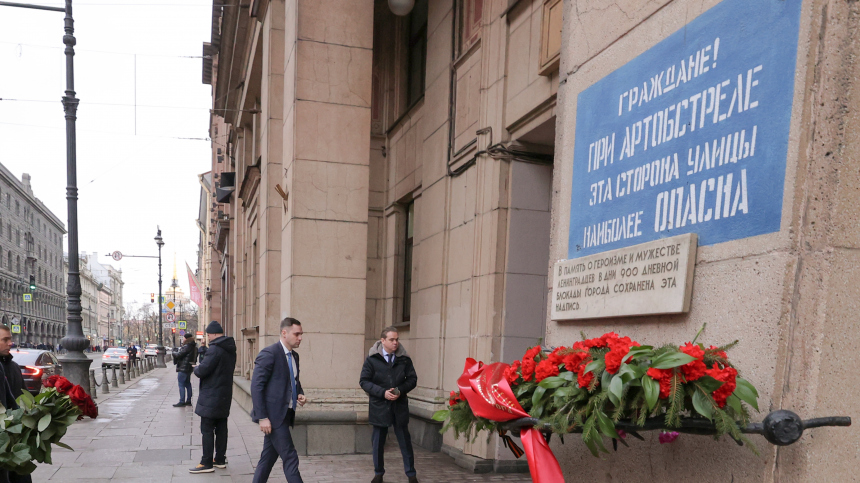 С самого утра петербуржцы несут цветы к мемориальной доске «Героизму и мужеству ленинградцев». Эта надпись на доме на Невском проспекте стала одним из символов стойкости жителей осажденного города. Она предупреждает, что при артобстреле именно эта сторона улицы смертельно опасна. Такие надписи каждый день помогали спасать жизни.