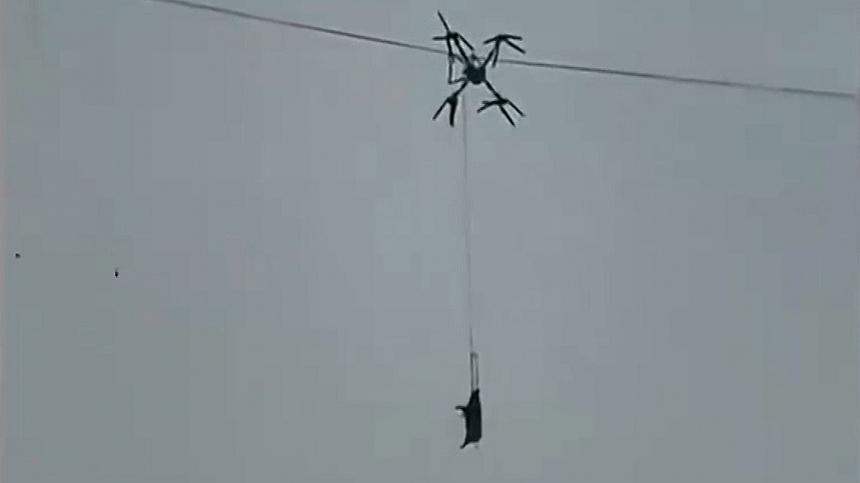 При попытке транспортировки животного с помощью квадрокоптера беспилотник зацепил провода.