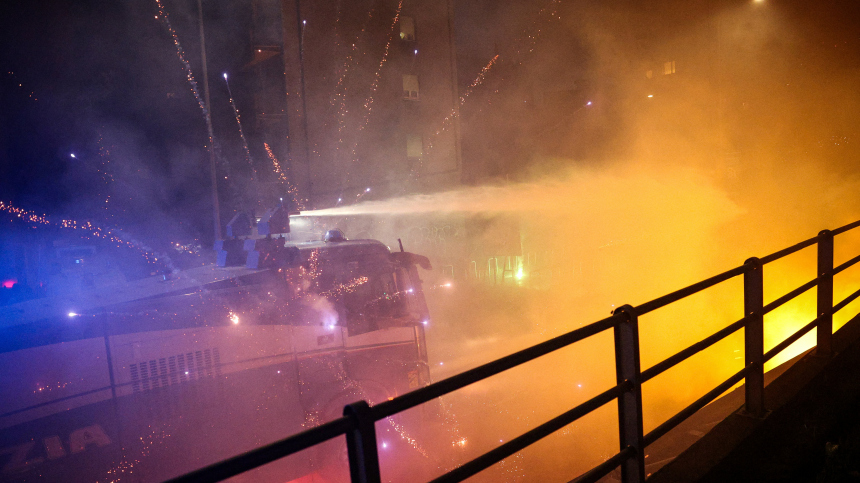 На агрессивные действия полиция ответила залпами водометов и применением дубинок. Итальянская пресса сообщила, что правоохранители задержали пятерых участников протеста, их всех доставили в участок.