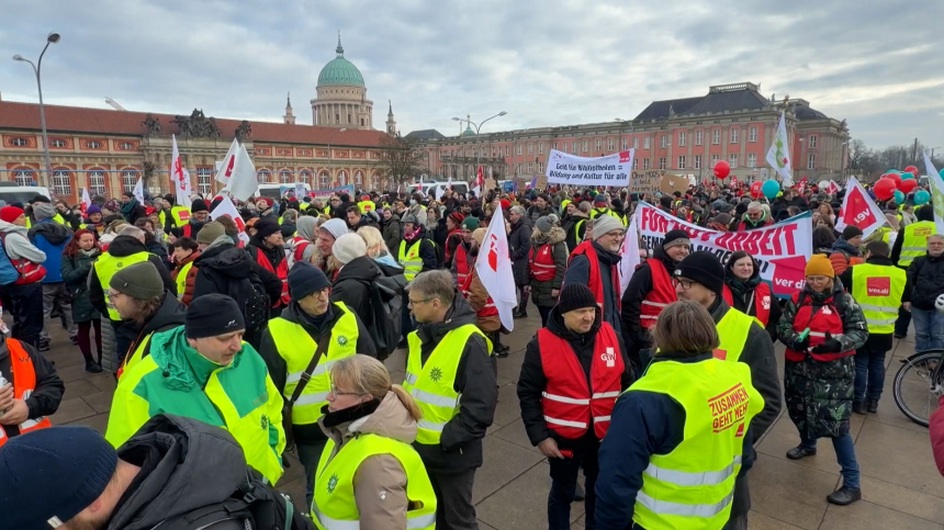 Тысячи детей не смогли пойти сегодня в школу и детский садик, немецкие правоохранители оставили свои посты. Германию сотрясает крупнейший социальный взрыв, буквально выброшенные уже на улицу немецкие бюджетники. Вплоть до сотрудников администраций. Те, кто и есть само государство, стоят с неприглядными картонками: «Какая зарплата — такой и плакат».