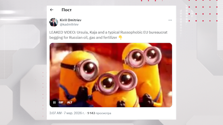 Спецпредставитель президента РФ по инвестиционно-экономическому сотрудничеству с зарубежными странами Кирилл Дмитриев сравнил европейских политиков с миньонами из мультфильма «Гадкий Я». Соответствующая публикация появилась на его странице в соцсети X.