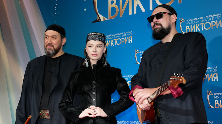 На красную ковровую дорожку гордо вышел фолк-коллектив из Уфы Ay Yola — Адель Шайхитдинова, ее отец Руслан Шайхитдинов и Ринат Рамазанов. Команда стала настоящим прорывом 2025 года после релиза мегапопулярного трека Homay, на премии она была представлена сразу в трех номинациях — «Поп-группа года», «Музыкальное видео года» и «Песня года». Музыканты соответствовали дресс-коду black tie, но традиционно дополнили образы деталями национальных костюмов.