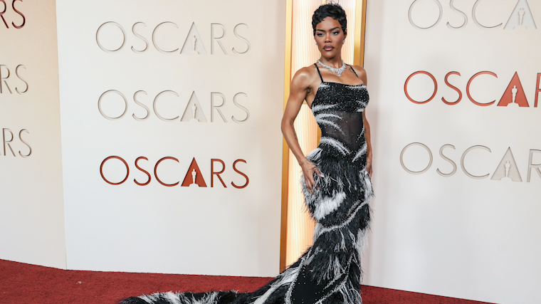 Актриса и певица Теяна Тейлор, сыгравшая в фильме «Битва за битвой», который в этот вечер получил награды, вышла на красную дорожку в черном платье Chanel. Наряд отличался строгим силуэтом и минималистичным кроем.