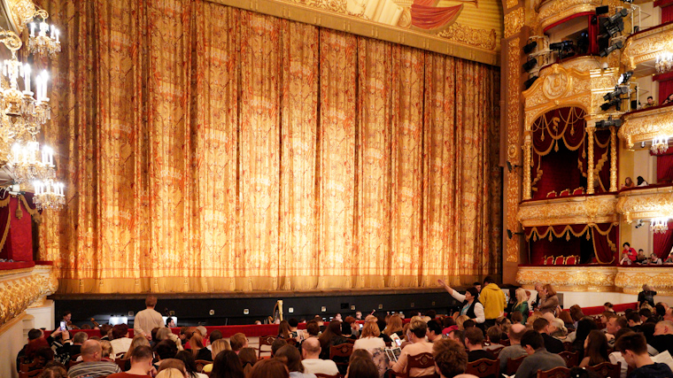 Еще одним узнаваемым символом Большого театра является «золотой занавес». Впервые он был создан в 1955 году. Занавес представляет собой гобелен, сотканный из шелковых и золотых нитей. Весит он довольно много — больше тонны. В 1990-е годы появился его аналог, который заменил советский вариант. Вместо звезд и колосьев на нем располагался двуглавый орел — герб нашей страны, а вместо надписи «СССР» написано «Россия».