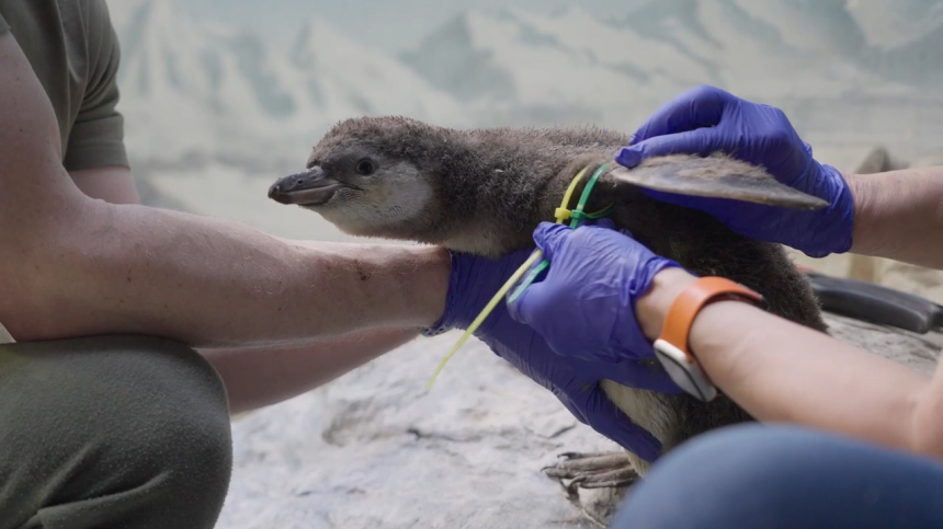 В возрасте около двух месяцев, когда крылья у малышей перестают расти, им ставят крылометки — пластиковые стяжки определенного цвета, чтобы быстро идентифицировать членов одной семьи. Позже у подросших пингвинят появятся электронные чипы.