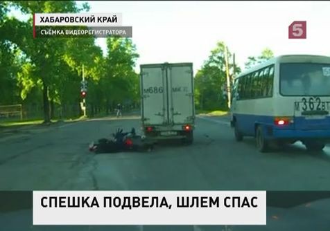 По всей видимости, мужчина не заметил как загорелся красный запрещающий сигнал и не успел среагировать на остановку грузовика. Первое время ездок не подавал признаков жизни, но быстро пришёл в себя. Очевидцы столкновения и медики оказали пострадавшему помощь. Несмотря на мощный удар, виновник ДТП отделался лишь ушибами - его спас шлем. А вот мотороллер восстановлению явно уже не подлежит.
