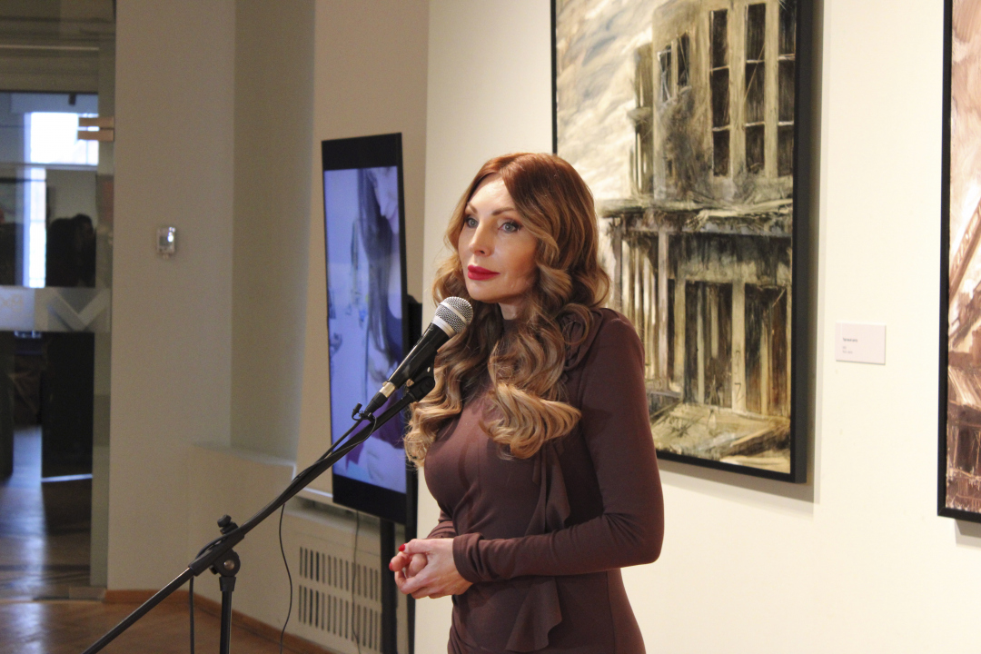 Актриса Наталья Бочкарева на открытии своей выставки «С любовью к родине моей» в Нижегородском государственном художественном музее, 2025 год.