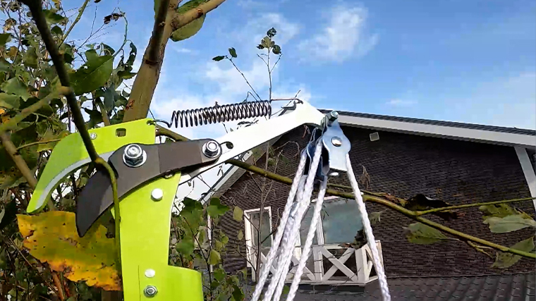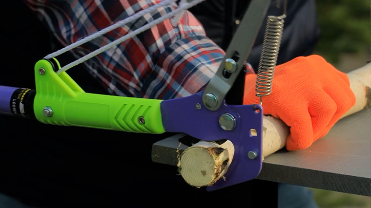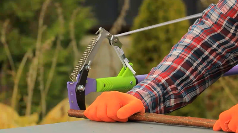 «Базовая конструкция. В принципе, она одна на всех секаторах, которые существуют. Это длинная палка, секатор на конце этой палки и корд, который помогает нам натягивать этот секатор с земли. То есть одной рукой мы держим палку удлиняющую, другой рукой мы дергаем за веревку. Тем самым отрезаем ветку», — комментирует эксперт.