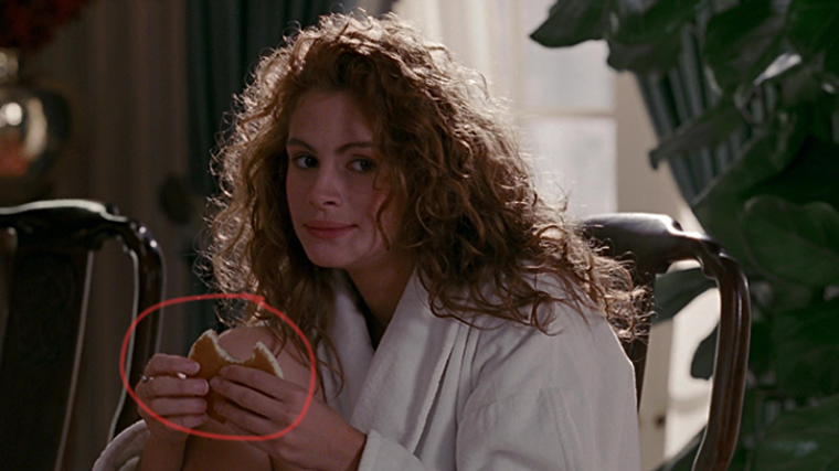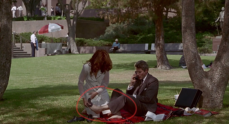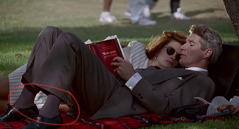 В сценах с пикником главные герои расположились на красном покрывале в городском парке. Пока Эдвард увлеченно болтал по телефону, персонаж Джулии Робертс время зря не теряла. Она сняла деловые туфли и носки с Ричарда Гира.