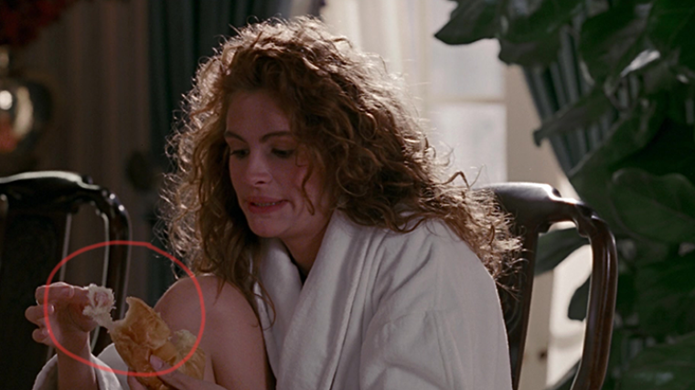 Красотка начала с пышного круассана, который видно на первом кадре. Но когда внимание перешло на собеседника, а потом вновь вернулось, Джулия Робертс держала в руках уже панкейк.