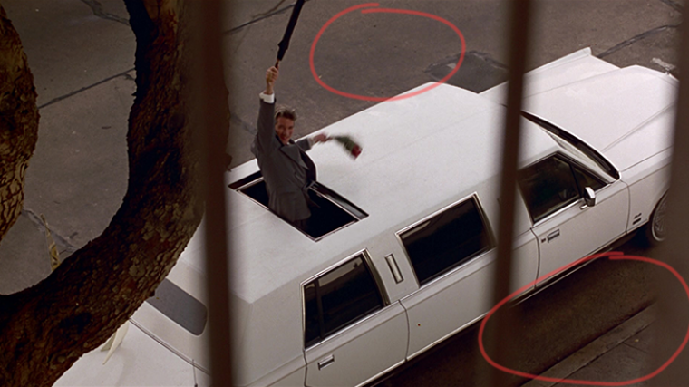 Но когда автомобиль паркуется на улице красотки, из люка высовывается Ричард Гир с маленьким букетом цветов в одной руке и зонтом-тростью в другой. Только вот упущение — асфальт-то сухой. Без малейшего намека на непогоду.