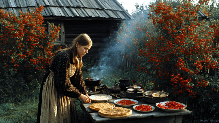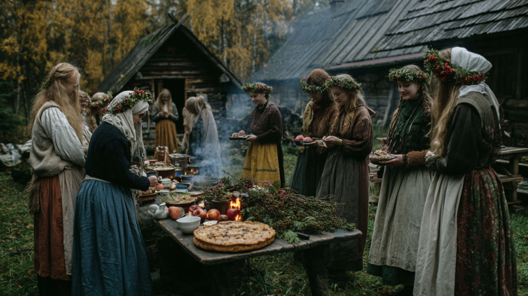 Не менее важной была рябина. Гроздья этой ягоды развешивали у входа в дом как защиту от нечистой силы. Из рябины готовили напитки — кисели, компоты, наливки. Пекли пироги с дарами осени — яблоками, капустой, брусникой. Быстрое поднятие теста считалось добрым знаком: к благополучию и изобилию.