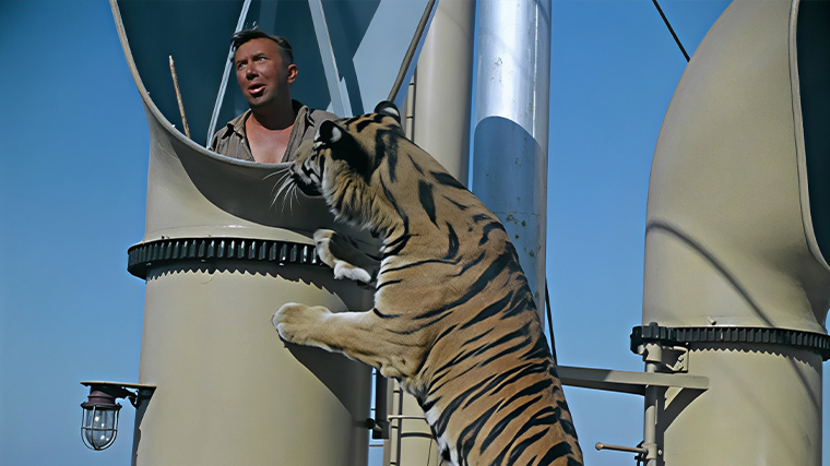 Одна из самых запоминающихся сцен — заплыв тигров. Все шло не по плану с самого начала. В первом дубле один из тигров вместо того, чтобы плыть к берегу, ловко залез на крышу клетки.